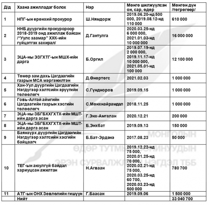 Өмгөөлөгч Б.Баасанцогт нь дансаар: НПГ-ын ерөнхий прокурор Ш.Нямдоржид 2019 оны зургадугаар сарын 20-нд 500 мянган төгрөг, 2019 оны наймдугаар сарын…