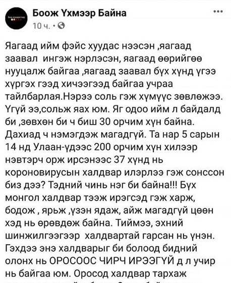 Яагаад ийм фэйс хуудас нээсэн ,яагаад заавал ингэж нэрлэсэн, яагаад өөрийгөө нууцалж байгаа ,яагаад заавал бүх хүнд үгээ хүргэх гээд хичээгээд байгаа учраа тайлбарлая. Нэрээ соль гэж хүмүүс зөвлөжээ. Үгүй ээ,сольж яах юм. Яг одоо ийм л байдалд би , зөвхөн би ч биш 30 орчим хүн байна. Дахиад ч нэмэгдэж магадгүй. Та нар 5 сарын 14 нд Улаан-үдээс 200 орчим хүн хилээр нэвтэрч орж ирсэнээс 37 хүнд нь короновирусын халдвар илэрлээ гэж сонссон биз дээ? Тэдний чинь нэг би байна!!!