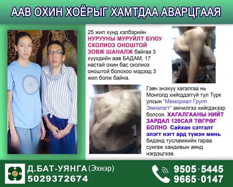 Гэтэл түүний 17 настай охин мөн л дээрх өвчнөөр өвчилсөн нь тогтоогджээ. Мөрөөдөл биелдэг нэвтрүүлэг Араг продакшн-ны хамт олон аав, охин хоёрыг аюулт өвчнийг нь эмчлүүлэхээр гадны эмнэлгүүдэд ханджээ. Учир нь энэ төрлийн хагалгаа манай улсад хийгддэггүй, гадны орнуудад өндөр үнээр хийгддэг байна.