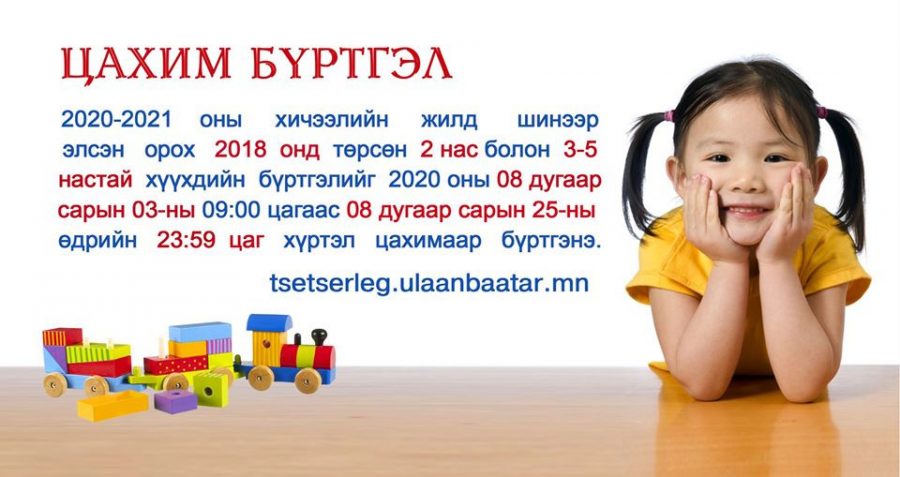 Бүртгэлийг tsetserleg.ulaanbaatar.mn (Сайтад шинэчлэл хийж байгаа тул одоогоор нэвтрэх боломжгүй) системээр наймдугаар сарын 3-ны 09:00 цагаас 25-ны өдрийгн 23:59 цаг хүртэл хийнэ.