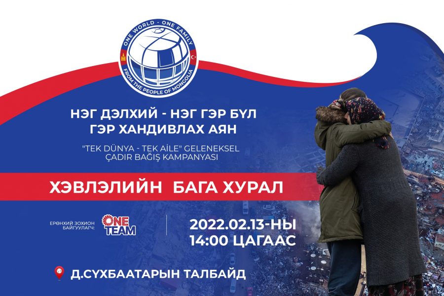 Байгалийн гамшигт нэрвэгдсэн Турк улсын ард түмэнд туслахаар “НЭГ ДЭЛХИЙ – НЭГ ГЭР БҮЛ” гэр хандивлах аяныг “One Team” ТББ зохион байгуулж байна.