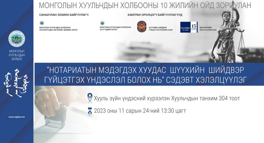 Маргааш буюу арваннэгдүгээр сарын 24-ны өдөр “Нотариатын мэдэгдэх хуудас шүүхийн шийдвэр гүйцэтгэх үндэслэл болох нь” сэдэвт хэлэлцүүлэг 13:30 цагт Хууль зүйн үндэсний хүрээлэнгийн Хуульчдын танхимд зохион байгуулагдана.