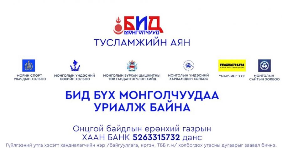 Тус аяны хандивыг Онцгой Байдлын Ерөнхий газрын хаан банкны данс 5263315732 руу сэтгэлийн хандиваа өргөхийг уриалж байна.