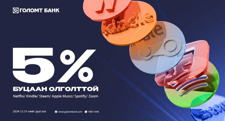 Та 2024.03.20-2024.12.31-нийг дуустал 8 сарын туршид дараах платформуудын subscription төлбөрийн хэрэгсэлд Голомт банкны Visa, Mastercard брэндийн кредит картууд болон SocialPay аппликэйшний бүх төрлийн виртуал картаа холбон төлбөр төлөөд 5%-ийн буцаан олголт авах боломжтой.