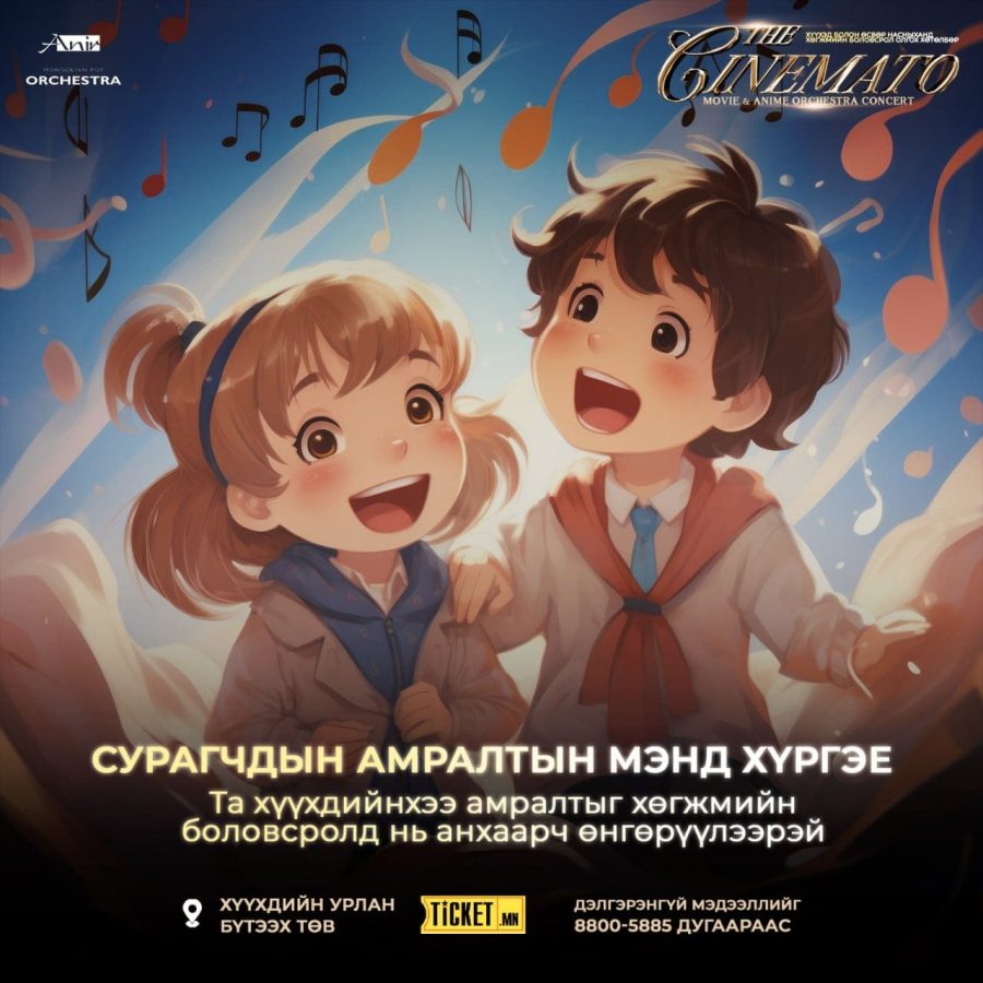 Та бүхнийг анги хамт олноороо, найз нөхдөөрөө, гэр бүлээрээ “THE CINEMATO” Movie & Anime orchestra concert үзэж сонирхохыг урьж байна. Тасалбарыг https://ticket.mn/event/2043 -с захиалах боломжтой.