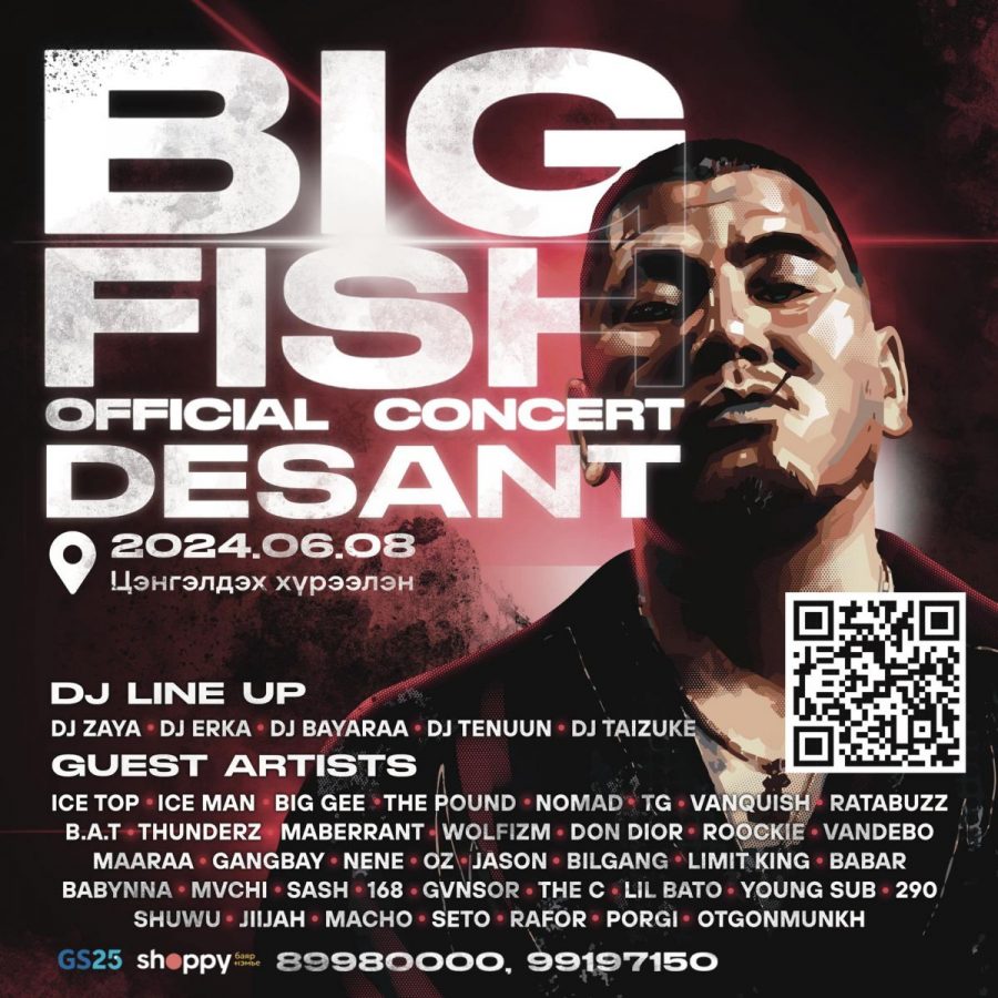 Хип хоп ертөнцийн акулудын нэг реппэр DESANT-ын бие даасан “Big Fish” тоглолт энэ сарын 8-ны өдөр Төв цэнгэлдэх хүрээлэнд зохион байгуулагдах гэж байгаа билээ.