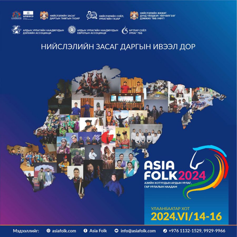 “Asia Folk 2024” Азийн хотуудын ардын урлаг, гар урлалын наадам Нийслэлийн Засаг дарга бөгөөд Улаанбаатар хотын захирагчийн ивээл дор 2024 оны 06-р сарын 14-16-ны өдрүүдэд Улаанбаатар хотноо зохион байгуулагдана.