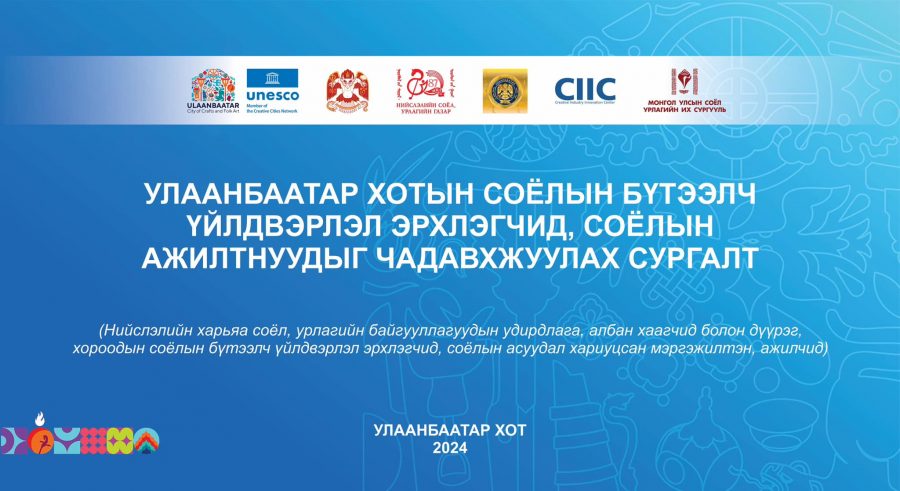 Нийслэл Улаанбаатар хот үүсэн байгуулагдсаны 385 жилийн ойн хүрээнд дэлхийн 90 гаруй улс, 350 гаруй хотыг нэгтгэсэн ЮНЕСКО-гийн “Бүтээлч хотуудын сүлжээ”-нд нийслэл Улаанбаатар хот нэгдэн орсонтой холбогдуулан “УЛААНБААТАР ХОТЫН СОЁЛЫН БҮТЭЭЛЧ ҮЙЛДВЭРЛЭЛ ЭРХЛЭГЧИД, СОЁЛЫН АЖИЛТНУУДЫГ ЧАДАВХЖУУЛАХ” сургалтыг Нийслэлийн Засаг даргын Тамгын газар, Нийслэлийн соёл, урлагийн газар, Нийслэлийн Бодлогын Судалгааны төвийн Нийгэм, эдийн засгийн судалгааны газар, Соёл, урлагийн Их сургууль хамтран Хан-Уул дүүргийн Соёлын ордны хурлын танхимд 2024 оны 09 дүгээр сарын 19-ний өдөр зохион байгуулав.
