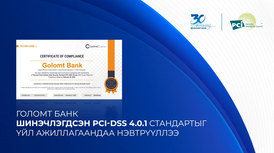 ​​​​​Голомт банк нь PCI SSC Аюулгүй байдлын Стандартын Зөвлөлийн олон улсын картын төлбөр тооцооны аюулгүй байдлын шинэчлэгдсэн PCI-DSS 4.0.1 стандартыг үйл ажиллагаандаа амжилттай нэвтрүүллээ.