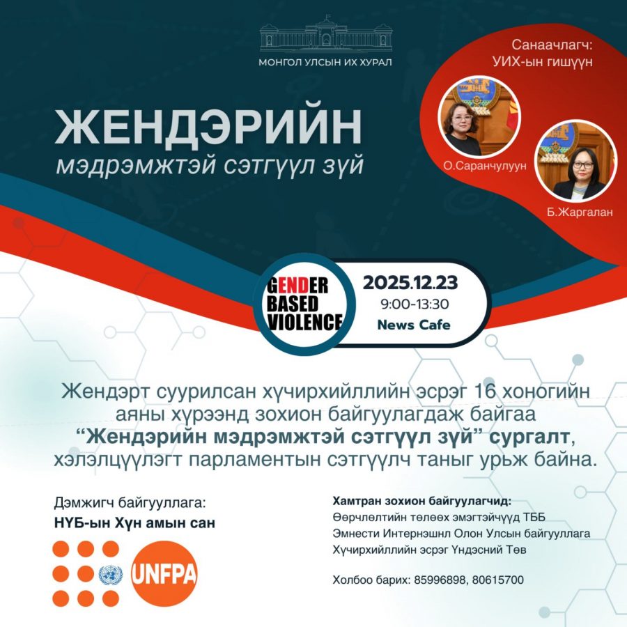 Энэхүү сургалт нь Жендэрт суурилсан хүчирхийллийн эсрэг 16 хоногийн аяны хүрээнд зохион байгуулагдаж байгаа бөгөөд сэтгүүлч нарыг урьж байна.
