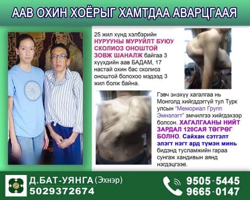 Аав охин хоёр хүнд өвчнөөр өвджээ. Гурван хүүхдийн аав Бадам анх 25 жилийн өмнө нурууны муруйлт буюу сколиоз өвчнөөр өвдөж...